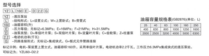 標(biāo)記示例:電機(jī)-泵裝置上置立式,郵箱容積160升,采用單級葉片泵,電動機(jī)功率2.2千瓦,工作壓力6.3MPa集成塊式的液壓泵站。